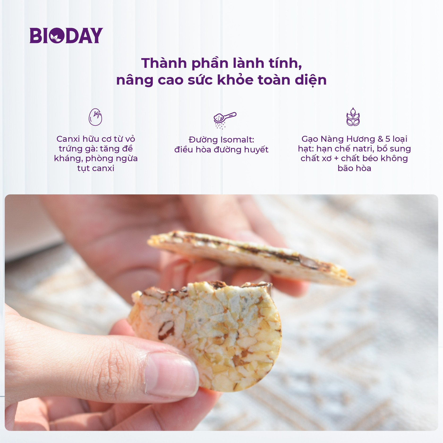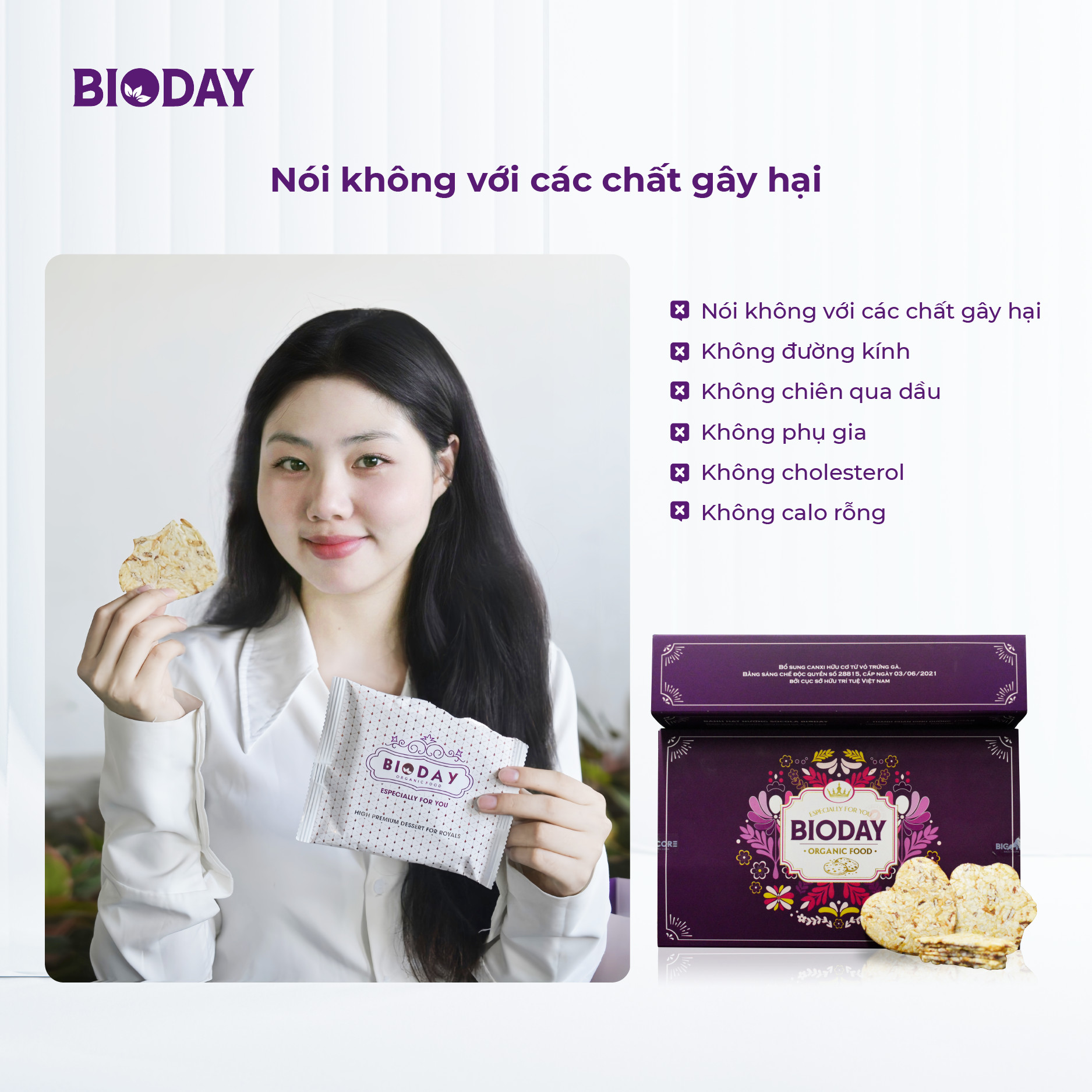 Được sản xuất bằng công nghệ rang ép nhiệt độc quyền, nói không với đường kính, dầu mỡ, cholesterol, chất phụ gia gây hại, Bánh hạt nướng BIODAY là loại bánh đáp ứng mọi yêu cầu khắt khe của các chế độ ăn kiêng & cũng là dòng bánh đầu tiên tại Việt Nam bổ sung canxi hữu cơ từ vỏ trứng gà độc quyền, mang lại các lợi ích: